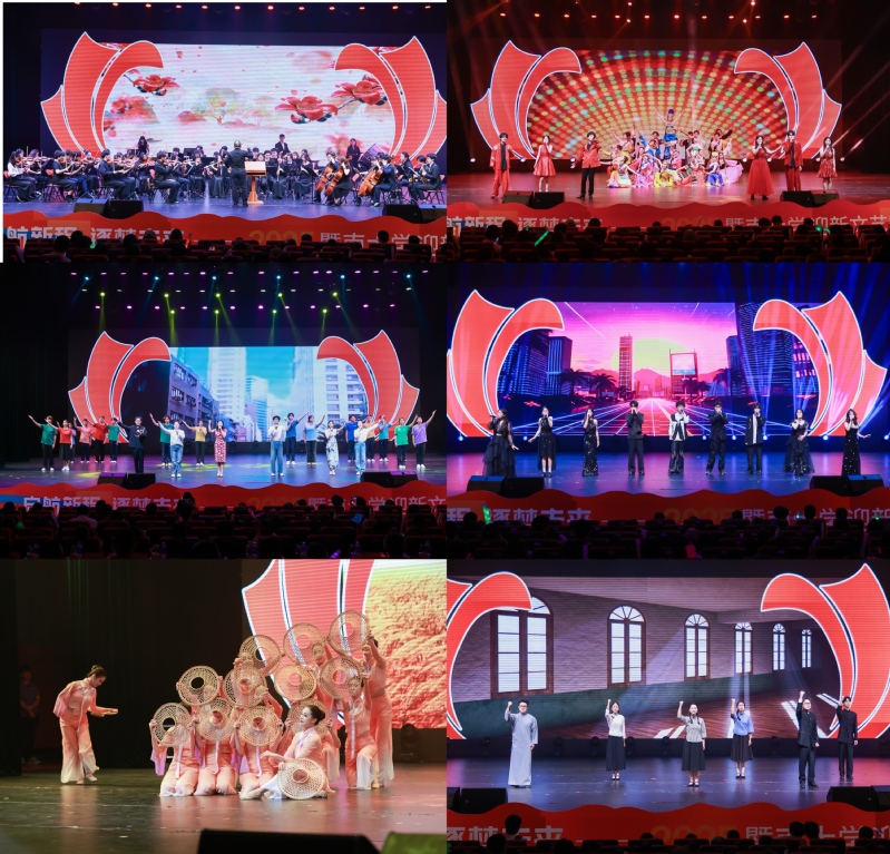 下篇 挺膺担当绘 “新”篇中,室内乐重奏《乘着歌声的翅膀》将想念远方的家和曾经的伙伴,化作前进的力量,让温暖的旋律,成为2025级新生彼此之间第一首共同的记忆;合唱《我的未来不是梦》它诉说着脚踏实地的坚持,也见证着暨南学子逐梦路上的成长;民乐《万疆》当民乐的悠扬奏响山河壮丽,我们仿佛能看见这片土地上的千年文明与万里风光,也更能体会我们这一代人所肩负的时代使命;舞蹈《红色颂歌》将烽火岁月的铮铮傲骨与青春年华的赤子之心,用舞蹈语言将信念展现出来;晚会最后,在激昂的《歌唱祖国》大合唱中圆满落幕。